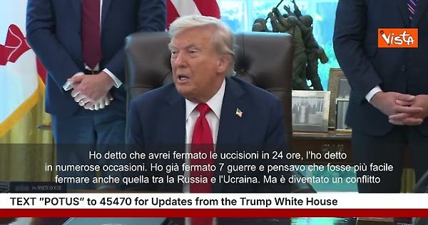 (Agenzia Vista) Usa, 25 agosto 2025 "Ho detto che avrei fermato le uccisioni in 24 ore, l'ho detto in numerose occasioni. Ho già fermato 7 guerre e pensavo che fosse più facile fermare anche quella tra la Russia e l'Ucraina. Ma è diventato un conflitto tra personalità forti. Dobbiamo fermarlo prima o poi. La settimana scorsa sono morti 7000 soldati. Di solito dico 5000, ma la settimana scorsa ne sono morti 7000-7225. Non sono nostri soldati ma sono comunque anime”. Lo ha detto il Presidente Usa Donald Trump parlando con i cronisti nello Studio Ovale della Casa Bianca. WhiteHouse Fonte: Agenzia Vista / Alexander Jakhnagiev