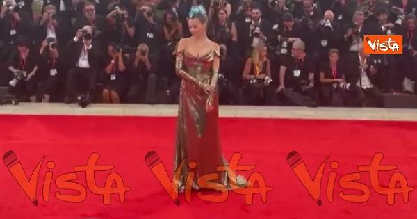 Rose Villain sfila sul red carpet dell'82esima Mostra del Cinema di Venezia con un abito metallizzato firmato Vivienne Westwood e una vistosa cresta punk azzurra.