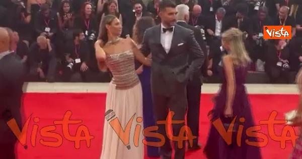 Beatrice Valli elegantissima in un abito bianco con dettagli argentati sfila sul red carpet dell'82esima Mostra del Cinema di Venezia accompagnata dal marito Marco Fantini