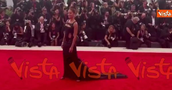 Venezia 82, Hiba Abouk sfila sul red carpet con un abito cut-out e corpetto ricamato