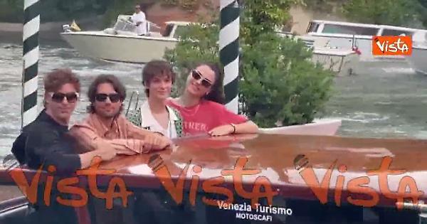 Michele Riondino, Paolo Strippoli, Giulio Feltri e Romana Maggiora Vergano arrivano al Lido a bordo di un taxi acqueo per presentare il film La valle dei sorrisi diretto da Paolo Strippoli.