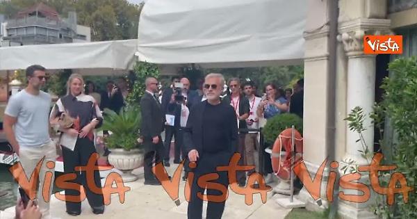 Christoph Waltz saluta i fotografi con "Buongiorno" al suo arrivo al Lido per la Mostra del Cinema Venezia 82