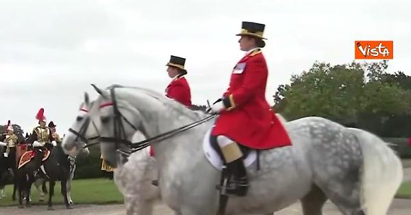 Il Presidente degli Stati Uniti Donald Trump e la first lady partecipano alla cerimonia di arrivo al castello di Windsor, che raggiunge a bordo di una carrozza trainata da cavalli bianchi.