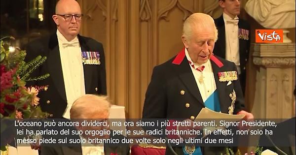 "L'oceano può ancora dividerci, ma per molti altri motivi ora siamo i più stretti parenti. Signor Presidente, lei ha parlato del suo orgoglio per le sue radici britanniche. In effetti, non solo ha messo piede sul suolo britannico due volte solo negli ultimi due mesi, ma ho capito che il suolo britannico offre campi da golf davvero splendidi." Così Re Carlo III del Regno Unito, durante un banchetto di Stato con il Presidente degli Stati Uniti Donald Trump , al Castello di Windsor.