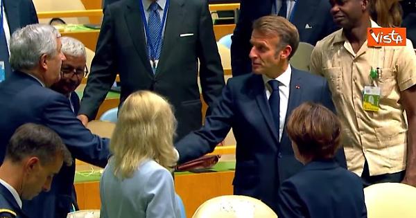 Il Presidente francese Emmanuel Macron al suo arrivo all'Assemblea generale dell'Onu a New York saluta gli altri leader con strette di mano. Tra questi, c'è anche il Ministero degli esteri italiano Antonio e Tajani.