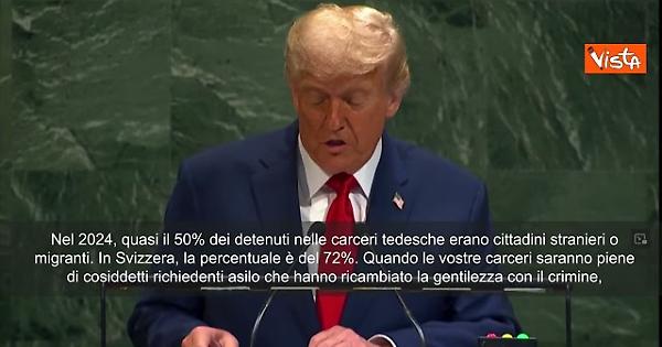 Quando i migranti hanno violato le leggi, presentato false richieste di asilo o rivendicato lo status di rifugiato per motivi illegittimi, in molti casi dovrebbero essere immediatamente rimborsati a casa. Dobbiamo risolvere il problema nei loro Paesi, non creare nuovi problemi nei nostri Paesi. Nel 2024, quasi il 50% dei detenuti nelle carceri tedesche erano cittadini stranieri o migranti... In Svizzera, la percentuale è del 72%. Quando le vostre carceri saranno piene di cosiddetti richiedenti asilo che hanno ricambiato la gentilezza con il crimine, sarà il momento di porre fine al fallito esperimento delle frontiere aperte. Il nostro messaggio è molto semplice: se entri illegalmente negli Stati Uniti, finirai in prigione, o tornerai da dove sei venuto, o forse anche più lontano. una volta che abbiamo iniziato a trattenere e deportare chiunque attraversasse il confine e a espellere gli immigrati clandestini dagli Stati Uniti, loro semplicemente hanno smesso di venire". Lo ha detto il Presidente Usa Donald Trump all'assemblea Onu.