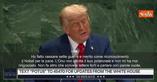 "Ho fatto cessare sette guerre e merito come riconoscimento il Nobel per la pace. L’Onu non sfrutta il suo potenziale e non mi ha mai ringraziato. Non fa altro che scrivere lettere forti e parlare con parole vuote", lo ha detto il Presidente Usa Trump all'Assemblea dell'Onu.
