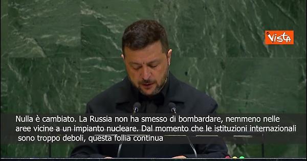 “Nulla è cambiato. La Russia non ha smesso di bombardare, nemmeno nelle aree vicine a un impianto nucleare. Dal momento che le istituzioni internazionali sono troppo deboli, questa follia continua.” Così il Presidente ucraino Volodymyr Zelensky, durante il suo intervento all'Assemblea generale dell'Onu, a New York.