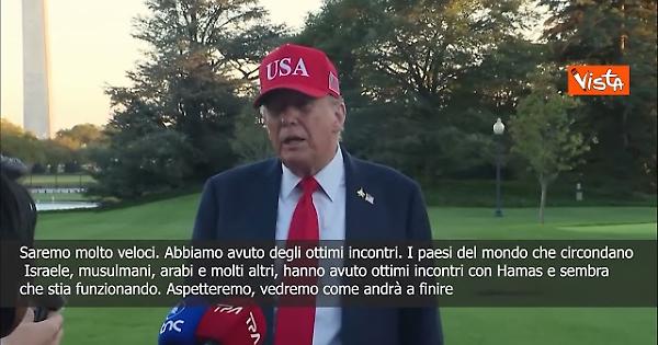 “Saremo molto veloci. Abbiamo avuto degli ottimi incontri. I paesi del mondo che circondano Israele, musulmani, arabi e molti altri, hanno avuto ottimi incontri con Hamas e sembra che stia funzionando. Aspetteremo un po', vedremo come andrà a finire.” Così il Presidente degli Stati Uniti Donald Trump, davanti alla Casa Bianca.