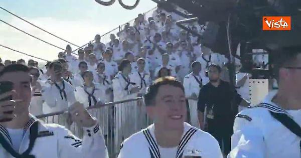 In occasione del 250esimo anniversario della Marina americana, Donald e Melania Trump hanno preso parte alla cerimonia “Titans of the Sea” a bordo della portaerei USS George H.W. Bush. Durante l’evento, la coppia presidenziale ha assistito a una maestosa esibizione delle forze navali, con manovre aeree, dimostrazioni dei Navy SEAL, lanci di missili e fuoco d’artiglieria sull’Atlantico. All'arrivo sul palco sul ponte della portaerei Trump ha ballato la sua iconica danza.