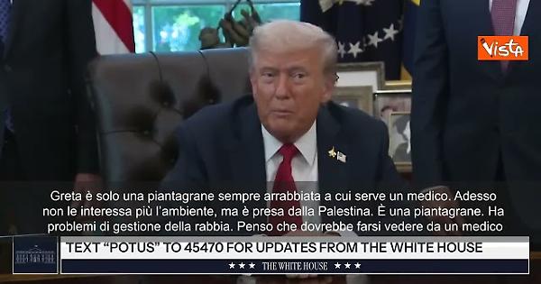 “Greta è solo una piantagrane sempre arrabbiata a cui serve un medico. Adesso non le interessa più l’ambiente, ma è presa dalla Palestina. È una piantagrane. Ha problemi di gestione della rabbia. Penso che dovrebbe farsi vedere da un medico”. Così dallo Studio Ovale il Presidente Usa Donald Trump ha parlato di Greta Thunberg, dopo la partecipazione dell’attivista svedese alla missione della Flotilla.