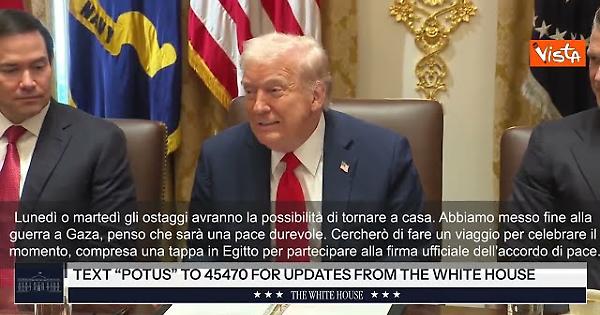 "Lunedì o martedì gli ostaggi avranno la possibilità di tornare a casa. Abbiamo messo fine alla guerra a Gaza, penso che sarà una pace durevole. Cercherò di fare un viaggio per celebrare il momento, compresa una tappa in Egitto per partecipare alla firma ufficiale dell'accordo di pace". Lo ha detto Donald Trump alla Casa Bianca.