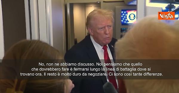 “No, non ne abbiamo discusso. Noi pensiamo che quello che dovrebbero fare è fermarsi lungo la linea di battaglia dove si trovano ora. Il resto è molto duro da negoziare. Ci sono così tante differenze. Quello che dico è che dovrebbero fermarsi ora lungo le linee del fronte, tornare a casa, smettere di uccidere. Il Donbass dovrebbe rimanere così com’è ora e le due parti potranno negoziare qualcosa più avanti”, lo ha detto Trump alla stampa sull’Air Force One.
