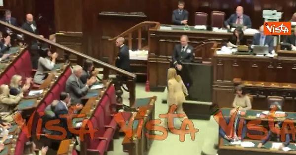Meloni saluta con la mano uscendo dall'Aula della camera dopo informativa su Consiglio Ue