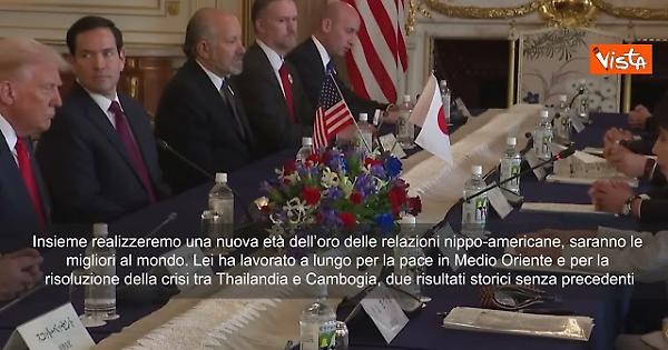 (Agenzia Vista) Giappone, 28 ottobre 2025 "Insieme realizzeremo una nuova età dell’oro delle relazioni nippo-americane, le migliori al mondo. Lei ha lavorato a lungo per la pace in Medio Oriente e per la risoluzione della crisi tra Thailandia e Cambogia, due risultati storici senza precedenti", lo ha detto la premier giapponese Sanae Takaichi durante il suo incontro con Trump a Tokyo. X Fonte: Agenzia Vista / Alexander Jakhnagiev