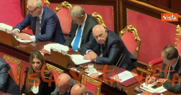 Il Guardasigilli Carlo Nordio tra i banche del Governo in Aula al Senato durante le dichiarazioni di voto e la votazione della Riforma della Giustizia.