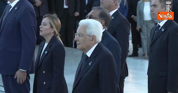 La premier Meloni canta l'Inno di Mameli durante l'esibizione della banda alla cerimonia per la Festa delle Forze Armate che si è svolta all'Altare della Patria alla presenza del Presidente della Repubblica Mattarella.