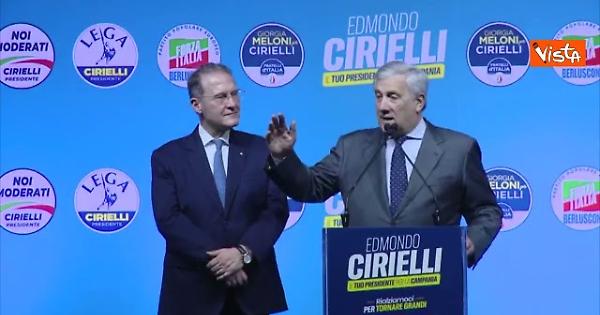"Silvio, Silvio, così la platea del comizio di Napoli per l'evento a sostegno del candidato del centrodestra Cirielli, quando il leader di Forza Italia Tajani ha ricordato Berlusconi e l'amore per la città partenopea.