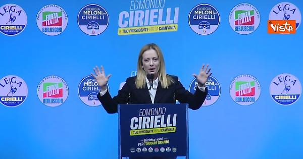 "Noi siamo tutti scemi a cospetto del genio, ma solo che questo si chiama gioco delle tre carte perchè De Luca cita volutamente solo le urgenti e brevi che sono notoriamente una quantità limitata e non dice cosa accade nelle altre classi che sono circa 80% delle prestazioni totali, lui non ve lo dice ma io si perchè si sa che sono un po' str...", così Giorgia Meloni al comizio del centrodestra a Napoli a sostegno di Edmondo Cirielli.