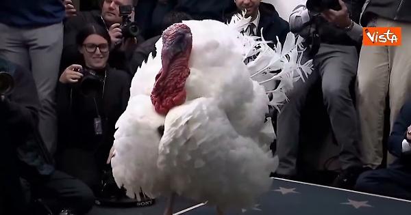 Il tacchino Waddle tra i cronisti alla Casa Bianca in posa per le foto come una star prima della cerimonia di grazia con il Presidente Trump e la moglie Melania in occasione del Ringraziamento. Waddle si è espresso con un gloglottio scatenando le risate dei giornalisti.