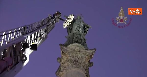 Come ogni anno, i vigili del fuoco hanno deposto all’alba una corona di fiori ai piedi della statua dell’Immacolata in Piazza di Spagna. Il gesto è stato compiuto da Roberto Leo, caporeparto e membro più anziano del Comando di Roma, che è salito a 27 metri sull’autoscala per rendere omaggio alla Vergine.