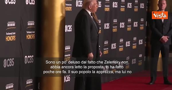 "Sono un po' deluso dal fatto che Zelensky non abbia ancora letto la proposta, lo ha fatto poche ore fa. Il suo popolo la apprezza, ma lui no", ha dichiarato il presidente Usa ai Kennedy Center Honors a Washington.