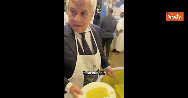 Il Ministro degli Esteri Tajani serve il risotto alla milanese alla festa all'Ambasciata italiana di Nuova Delhi, in India, dopo la nomina della cucina italiana patrimonio immateriale dell'Unesco.