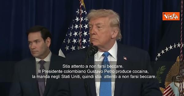 (Agenzia Vista) Usa, 04 gennaio 2026 "Stia attento a non farsi beccare. Il Presidente colombiano Gustavo Petro produce cocaina, la manda negli Stati Uniti, quindi stia attento a non farsi beccare.". Lo ha detto il Presidente americano Donald Trump nella conferenza stampa in Florida dopo l'arresto del Presidente venezuelano Nicolas Maduro. X Fonte: Agenzia Vista / Alexander Jakhnagiev