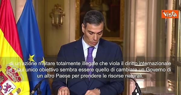 (Agenzia Vista) Parigi, 06 gennaio 2026 “Il governo di Spagna non ha riconosciuto il Governo di Maduro, perché ha infranto le regole e la sua elezione fu illegittima. Proprio per questo non può riconoscere la legittimità di un’azione militare totalmente illegale che viola il diritto internazionale e il cui unico obiettivo sembra essere quello di cambiare un Governo per prendere le risorse naturali. L’operazione a Caracas è un precedente terribile e molto pericoloso, che ricorda le aggressioni del passato”. Lo ha detto il Presidente della Spagna Pedro Sanchez in una conferenza stampa dal Palazzo dell’Eliseo. Courtesy: X La Moncloa Fonte: Agenzia Vista / Alexander Jakhnagiev