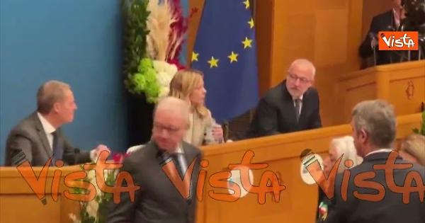 La premier Meloni arriva alla conferenza stampa di inizio anno con i giornalisti.