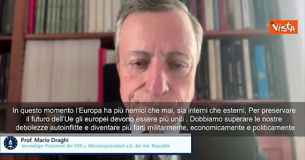 “In questo momento l’Europa ha più nemici che mai, sia interni che esterni. Per preservare il futuro dell’Ue gli europei devono essere più uniti . Dobbiamo superare le nostre debolezze autoinflitte e diventare più forti militarmente, economicamente e politicamente”, lo ha detto l’ex Presidente della Bce ed ex presidente del Consiglio italiano in un videomessaggio realizzato dopo che la città di Aquisgrana gli ha assegnato il premio Carlo Magno per l’integrazione europea.
