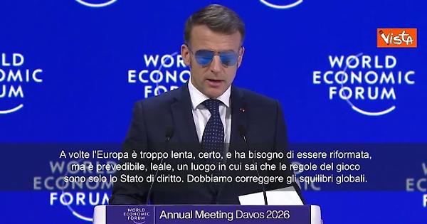 (Agenzia Vista) Davos, 21 gennaio 2026 "A volte l'Europa è troppo lenta, certo, e ha bisogno di essere riformata, ma è prevedibile, leale, un luogo in cui sai che le regole del gioco sono solo lo Stato di diritto. Dobbiamo correggere gli squilibri globali. Abbiamo bisogno di più crescita e più stabilità. Preferiamo il rispetto ai bulli e preferiamo lo Stato di diritto alla brutalità. Siete i benvenuti in Europa e siete più che benvenuti in Francia", lo ha detto Macron al Forum di Davos. Wef Fonte: Agenzia Vista / Alexander Jakhnagiev