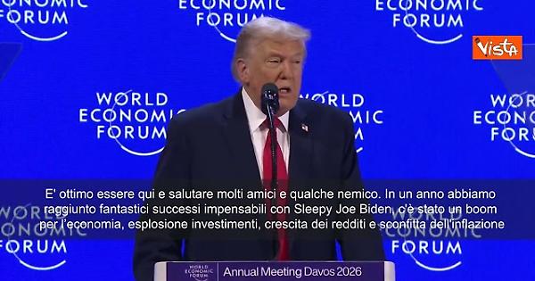 (Agenzia Vista) Davos, 21 gennaio 2026 "E' ottimo essere qui e salutare molti amici e qualche nemico. In un anno abbiamo raggiunto fantastici successi impensabili con Sleepy Joe Biden, c'è stato un boom dell'economia, l'esplosione degli investimenti, la crescita dei redditi e la sconfitta dell'inflazione". Lo ha detto il presidente degli Stati Uniti Donald Trump nel suo intervento al World Economic Forum di Davos. Wef Fonte: Agenzia Vista / Alexander Jakhnagiev
