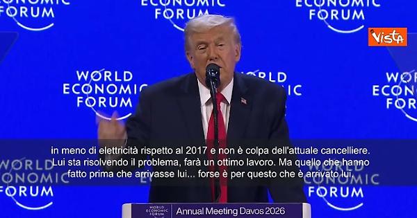 (Agenzia Vista) Davos, 22 gennaio 2026 "A causa della mia vittoria elettorale schiacciante, gli Stati Uniti hanno evitato il catastrofico collasso energetico che ha colpito ogni nazione europea che ha perseguito la "truffa del Green New Deal". Forse la più grande bufala della storia. Pale eoliche ovunque, distruggono la vostra terra. Qui in Europa, abbiamo visto il destino che la sinistra radicale ha cercato di imporre all'America. La Germania ora genera il 22% in meno di elettricità rispetto al 2017 e non è colpa dell'attuale cancelliere. Lui sta risolvendo il problema, farà un ottimo lavoro. Ma quello che hanno fatto prima che arrivasse lui... forse è per questo che è arrivato lui. E i prezzi dell'elettricità sono il 64% più alti. Il Regno Unito produce solo un terzo dell'energia totale che produceva nel 1999. Pensateci, un terzo, e si trovano sopra il Mare del Nord, una delle più grandi riserve al mondo, ma non lo usano. E questo è uno dei motivi per cui la loro energia ha raggiunto livelli catastroficamente bassi con prezzi altrettanto alti. Più pale eoliche ha un Paese, più soldi perde e peggio va. In Cina le producono ma usano carbone, petrolio, gas e nucleare”. Lo ha detto Trump a Davos. Wef Fonte: Agenzia Vista / Alexander Jakhnagiev